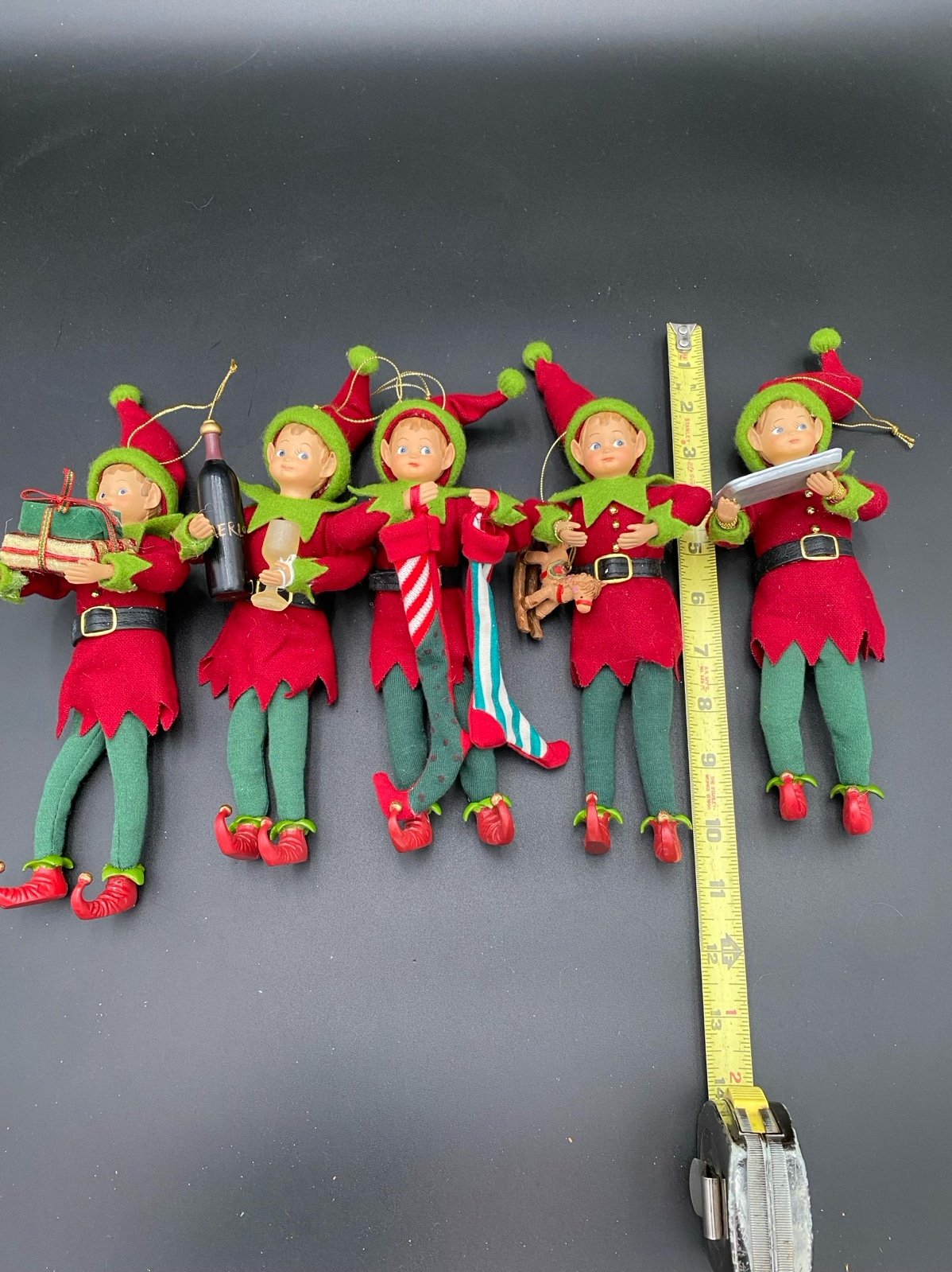 Can be hung on the tree or sat on table, shelf or mantle. Fully Posable including ankles, knees, hips body arms and even their hats. Tuck their knees or sit the on your mantle. Nicely made and dressed in felt with very animated faces and pointed ears. No damage or odors. 8” tall not including their hats.