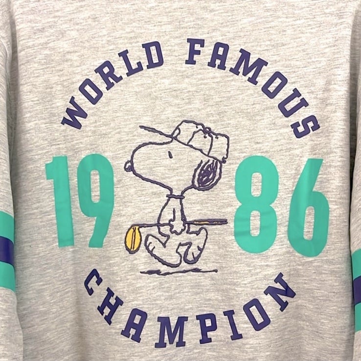 Classic gray crewneck with Snoopy playful Swing graphic on front and World Famous Champion graphic on back. Features colorful sleeve stripes. Ideal for casual wear.